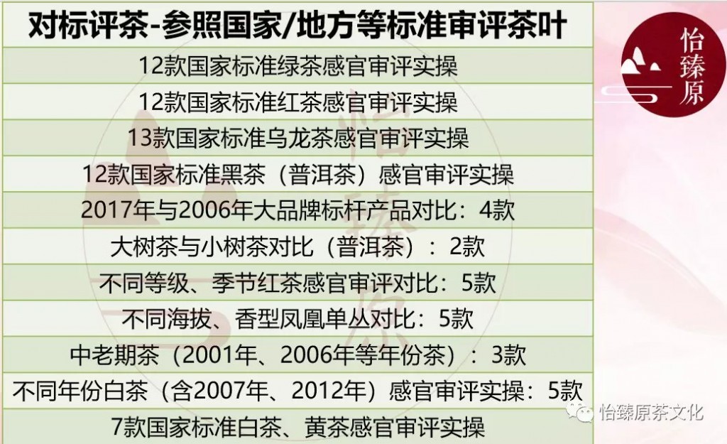 学评茶,入门课程很重要。怡臻原科学系统的依照国家审评指引合理设计课程内容,课程所使用的茶样是从国家标准茶样种筛选的具有市场代表性的60多款茶样,使学员对六大茶类有准确的学习和了解。