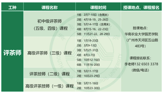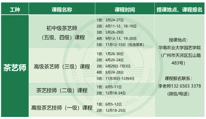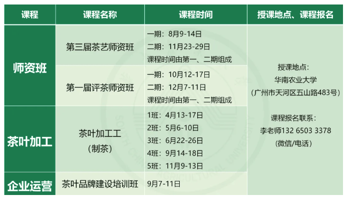 2026年华南农业大学师资班、茶叶加工工、企业运营课程安排与班次: